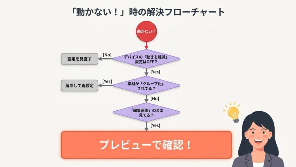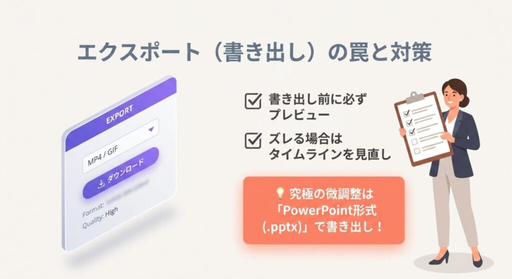 必ず書き出し前にプレビューで動作確認する習慣をつけましょう。