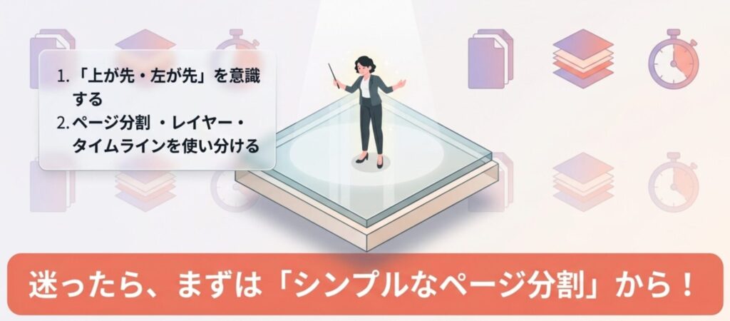 - 1ページ目に最初に表示したい素材だけ配置し、アニメーションを設定する