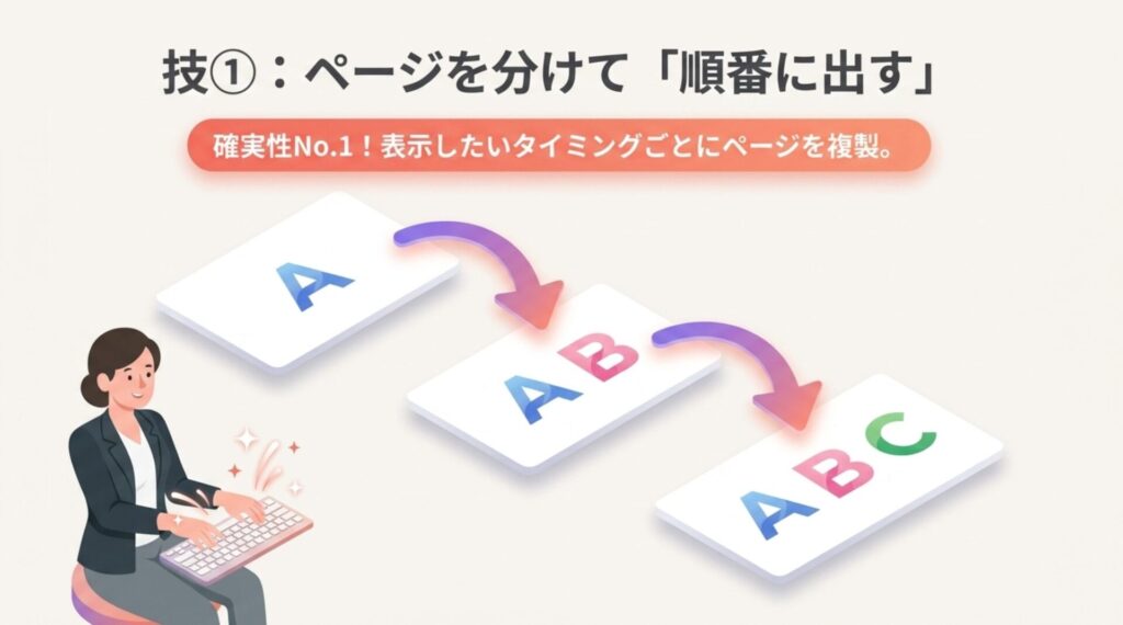 - 1ページ目を複製し、2ページ目に「1ページ目の素材+次に表示したい素材」を配置する