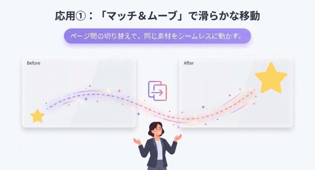 同じ素材がページをまたいでスムーズに移動しているように見せることができます。