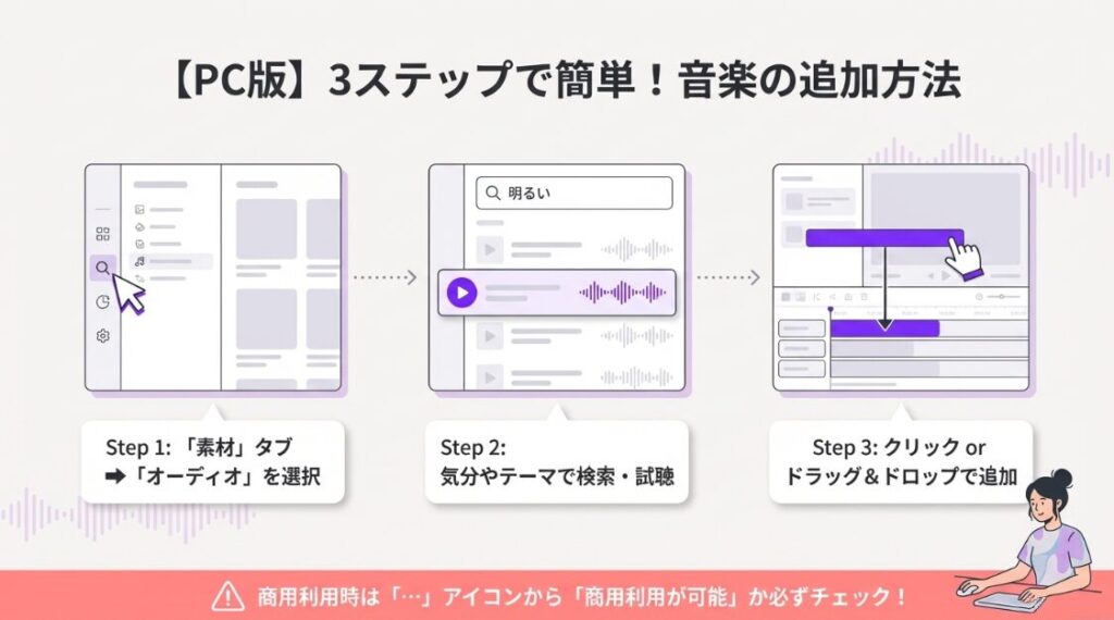 パターン①:Canva内のフリー音源・素材を利用する(手軽さ重視)