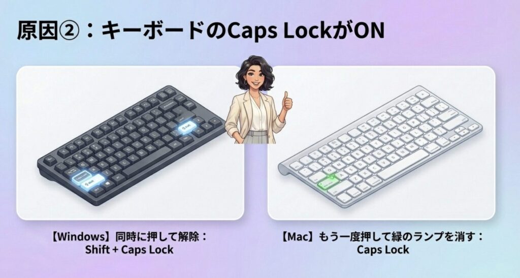 キーボードの「Caps Lock(キャプスロック)」がオンになっていると、