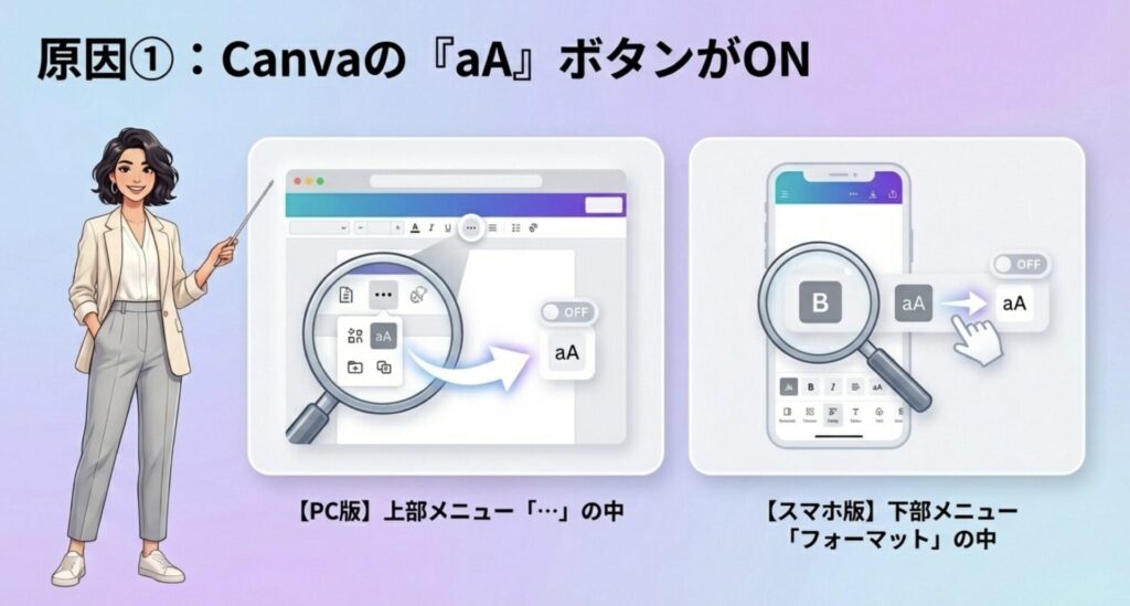 • Canvaの「大文字モード(aAボタン)」がオンになっている