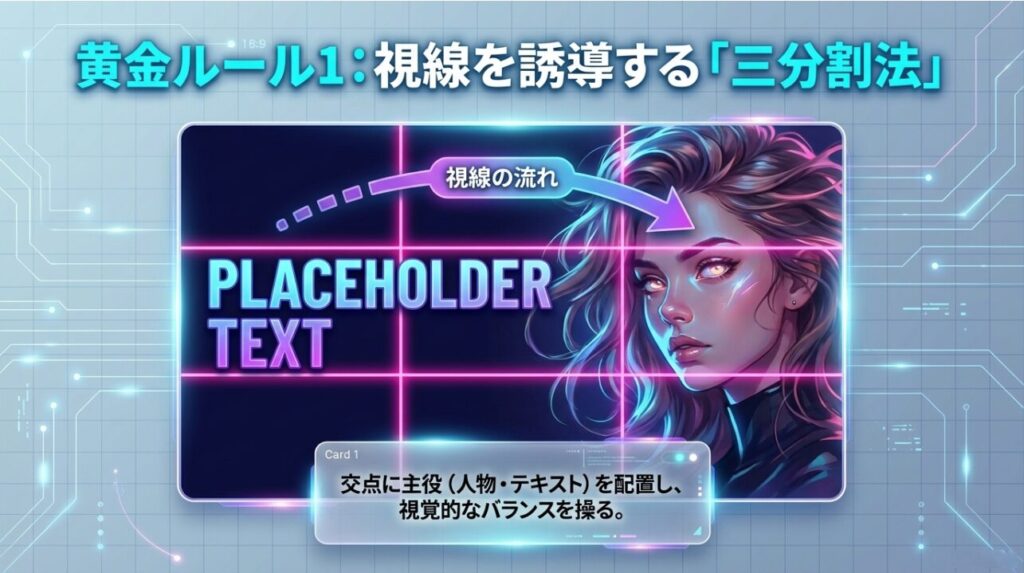 キャンバスを縦横に3分割し、その交点や線上に主役(人物・テキスト)を配置することで、