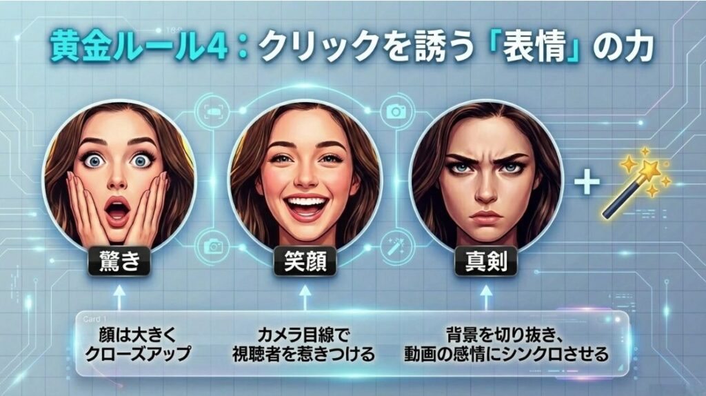 - 表情は動画の内容に合ったもの(驚き・笑顔・真剣)を選ぶ