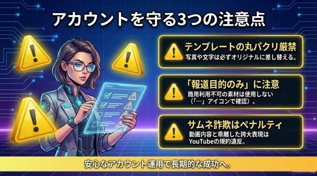 動画内容と異なるサムネイル(いわゆる「サムネ詐欺」)はペナルティの対象になります。