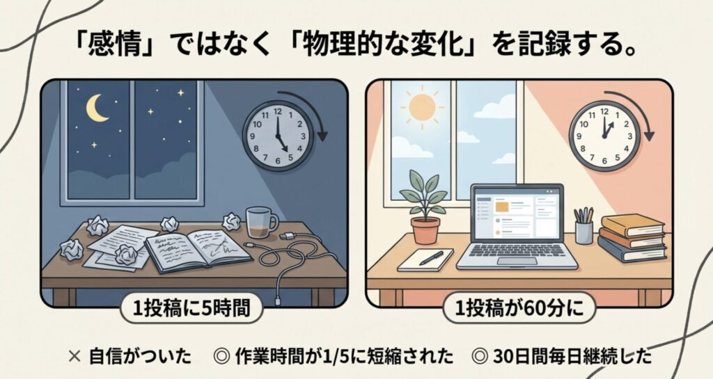 「これまで1投稿に5時間かかっていたのが、 メソッドにより60分で完成するようになった」