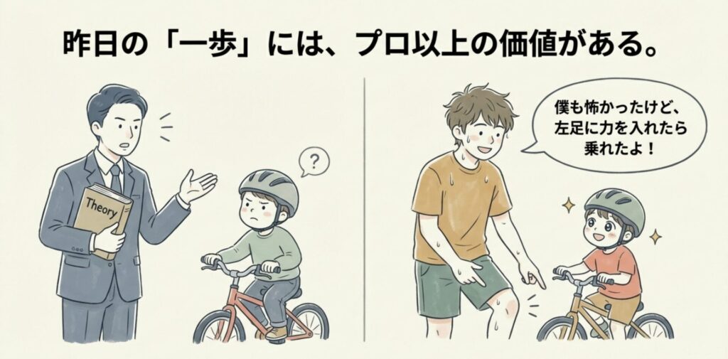 「僕も怖かったけど、左足に力を入れたら乗れたよ!」と言う言葉には、